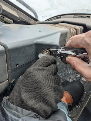 An hour or so later, Avi decided that he'd try to warm up the PistenBully again. Alan and I watched his face become increasingly concerned through the window, until he finally ran out and said "Alan, I need you for this". It turns out that the ignition switch was loose, so that turning the key would spin all the way around in a circle and never actually click. Avi had to hold the ignition with a screwdriver while Alan turned the key.